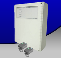 Central de 2 zonas. Incluye receptor de RF para sensores inalámbricos y dos transmisores de control remoto con teclas independientes para activación en modos Estoy y Me voy. |